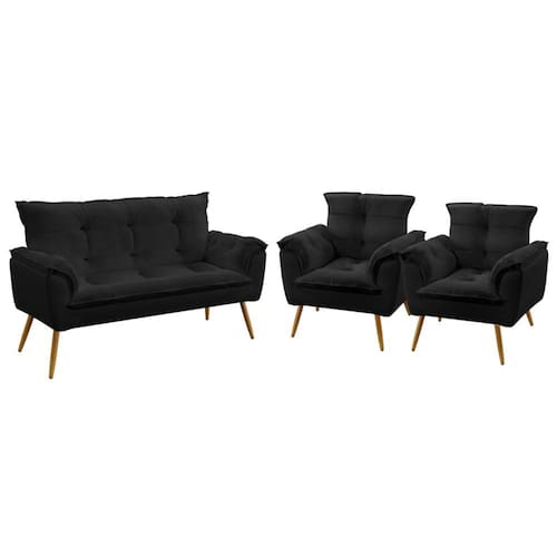 Kit Poltrona Namoradeira e 2 Poltronas Beta Sued Aradecor - Preto