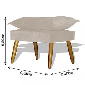 - Puff Retangular; - Estrutura em Madeira MDF - Acabamento Tecido Suede - Revestimento em fibra siliconada - 04 Pés palito; - Sistema de montagem: Parafs.