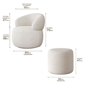 A poltrona proporciona aconchego absoluto para relaxar, enquanto o puff complementa a experiência com versatilidade, podendo ser utilizado como apoio para os pés ou assento auxiliar. Ideal para sala de estar, quarto ou cantinho de leitura, é a escolha perfeita para elevar a decoração com personalidade, funcionalidade e sofisticação.