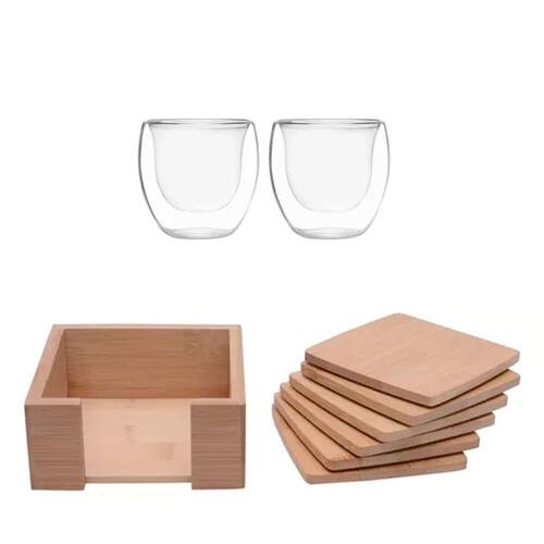 Kit Porta 6 Copos De Bambu + Par De Copos Borossilicato