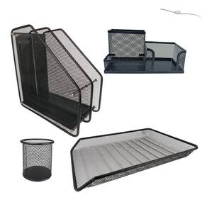 Kit organizadores de escritório preto composto por: - 01 bandeja organizadora simples preto - 01 organizador de mesa com 3 partições preto - 01 arquivo duplo organizador - 01 porta caneta preto