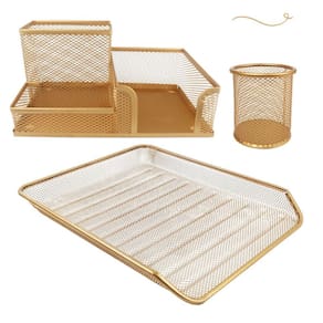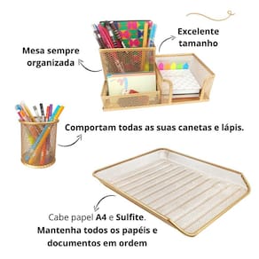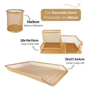 KIT ESCRITÓRIO HOME OFFICE MARKYS STORE DOURADO OURO Para quem gosta de ter tudo sempre à mão, com agilidade e praticidade. Kit de organizadores de escritório é ideal para você. Com eles, você vai evitar a perda de tempo procurando os itens de que precisa e que usa com frequência. Tudo estará a sua mão. KIT ORGANIZADORES DE ESCRITÓRIO COMPOSTO POR: - 01 Bandeja Organizadora Simples Dourado - 01 Organizador de Mesa com 3 partições Dourado - 01 Porta Caneta Dourado Cor: Dourado Ouro Material: Metal TAMANHOS: - Porta Caneta Tamanho: 10x9cm (Altura x Diâmetro) - Bandeja Organizadora de Mesa Tamanho: 4x27,5x35cm (Altura x Largura x Comprimento) - Organizador de Mesa com 3 partições Tamanho: 20x10x10cm (Largura x Comprimento x Altura)