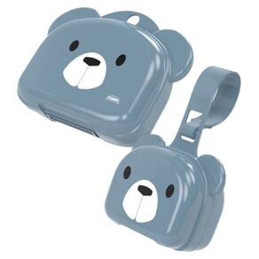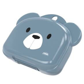 Saboneteira com fechamento de pressão abre fácil, com decoração infantil na face principal, orelhas salientes e uma pequena alça de transporte.