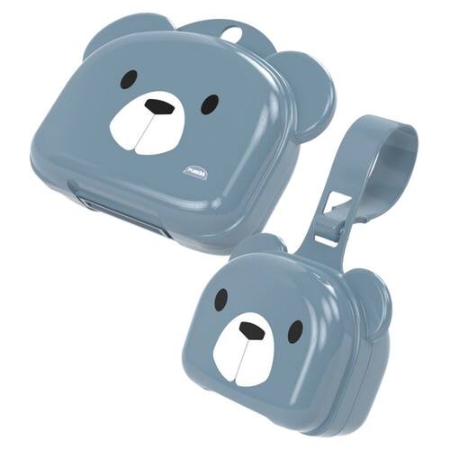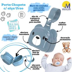 Porta chupeta com fechamento de pressão abre fácil, com decoração infantil na face principal, orelhas salientes e uma pequena alça de transporte que também se ajusta para prender em bolsas e mochilas.