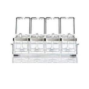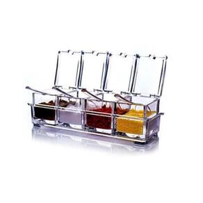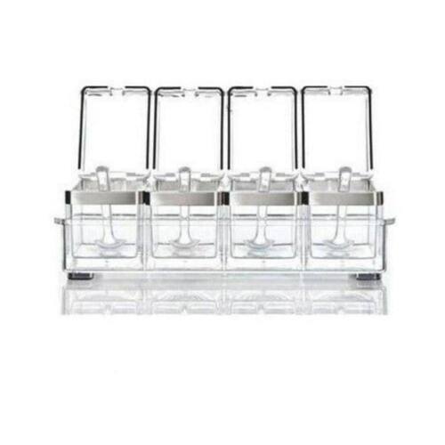 A caixa contém quatro recipientes de plástico colocados em uma bandeja. Os compartimentos destacáveis são feitos com tampas de tipo prensa e equipadas com colheres. Os compartimentos de armazenamento também podem ser usados para armazenar outras especiarias / ingredientes como você preferir. Fácil de procurar esses ingredientes escondidos. Muito útil para uso na sua cozinha.