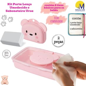 Kit Baby Ursa 2 peças, composto por 1 Porta Lenço Umedecido com fechamento hermético e 1 Saboneteira com fechamento de pressão. Todos os itens do conjunto são fabricados pela Plasútil e produzidos em polipropileno de alta resistência e durabilidade, além de material atóxico livre de bisfenol (BPA Free) em sua composição, garantindo contato 100% seguro às crianças. Os produtos formam um kit com decoração coordenada pra lá de exclusiva.