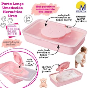 Porta Lenço Umedecido com fechamento hermético de borracha nas tampas principal e central, sendo o recipiente principal liso na cor rosa e tampa abre fácil com decoração injetada em formato de ursa também da mesma cor e tampa hermética 100% transparente com vedação de borracha.