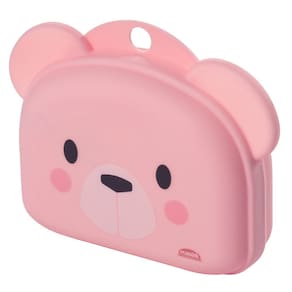 Saboneteira com fechamento de pressão abre fácil, com decoração infantil na face principal, orelhas salientes e uma pequena alça de transporte.