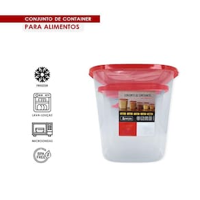 Kit Porta Mantimentos com 5 Peças - Vermelho O kit com 5 Potes porta mantimentos, têm diferentes capacidades para que seja armazenado diferentes tipos de alimentos, mantimentos e até produtos de limpeza. Produzidos em plástico resistente, suporta peso e podem ser empilhados, ideal para armazenar, arroz, feijão, café, açúcar e farinha, mas também podem ser utilizados para armazenar produtos de limpeza como, sabão em pó, amaciante, sabão em pedra entre outros. - Livre de BPA;- Atóxico;- Pode ir no Freezer, microondas e lava-louças.