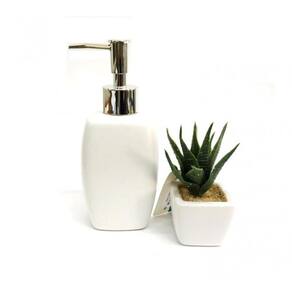 Este kit exclusivo para banheiro contempla 01 Porta Sabonete Líquido em porcelana branca com dosador em plástico e acabamento cromado, e ainda um mini vaso em cerâmica branca com uma planta suculenta artificial - Jolitex Ternille.