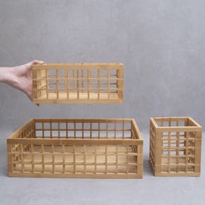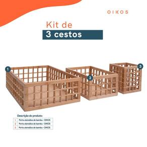 Conheça o Kit de porta utensílios de bambu e cesto vazado de bambu da OIKOS.Resistente, multiuso e com design moderno, é o kit ideal para organizar e acomodar bem seus itens. O porta utensílios é funcional, decorativo e mantém tudo no lugar. O cesto vazado é versátil e pode ser utilizado na cozinha, no quarto e até no banheiro!Os dois são de bambu. Para limpar, basta utilizar um pano úmido, secar e deixar em local arejado.Leve qualidade e modernidade para sua casa!O kit contém:Porta utensílios de bambu2 Cestos vazado de bambu 26cm e 38cm