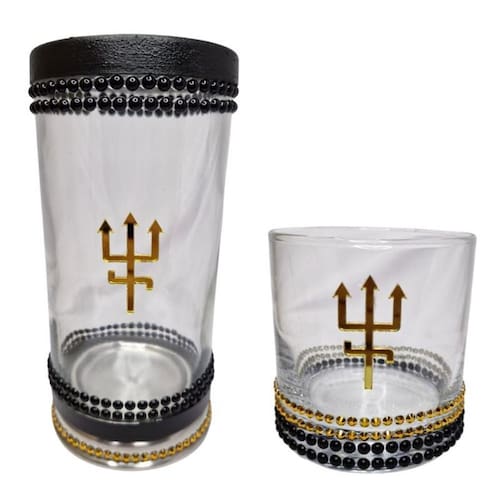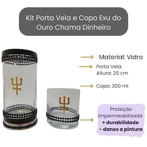 Kit Porta Vela e Copo Exu do Ouro Chama Dinheiro Tridente Copo Whisky Exu do Ouro Chama Dinheiro Tridente 300 ml