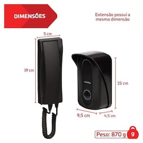 As dimensões da placa de rua são altura: 15cm, largura: 9,5cm e profundidade: 4,5cm. Já as dimensões do monofone são altura: 19cm e largura: 5cm. O kit inclui 01 placa de rua, 02 monofones, 01 capa protetora, 01 base e 01 jogo de parafusos.