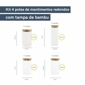 Esse conjunto contém 4 peças: 1 unidade - POTE 450ML DE VIDRO COM TAMPA DE BAMBU CIRCULAR MANTIMENTO - OIKOS Diâmetro: 6,5cm / Altura: 18cm 1 unidade - POTE 600ML DE VIDRO COM TAMPA DE BAMBU CIRCULAR MANTIMENTO - OIKOS Diâmetro: 8,5cm / Altura: 15cm 1 unidade – POTE 1100ML DE VIDRO COM TAMPA DE BAMBU CIRCULAR MANTIMENTO - OIKOS Diâmetro: 9,5cm / Altura: 19cm 1 unidade - POTE 1650ML DE VIDRO COM TAMPA DE BAMBU CIRCULAR MANTIMENTO - OIKOS Diâmetro: 10cm / Altura: 24cm