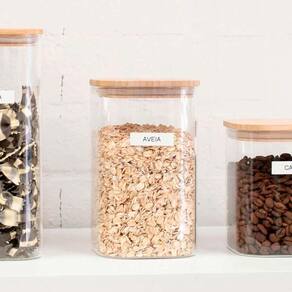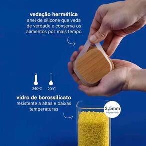 - Ideais para armazenar e organizar, os potes herméticos são mais práticos e seguros; - O pote hermético de 1,1 litros, armazena alimentos secos e até mesmo pequenos objetos, auxiliando na organização de diversos ambientes da casa; - Com fechamento hermético e corpo incolor, garante a conservação e identificação rápida do conteúdo interno; - Confeccionado em vidro Borossilicato e tampa em bambu; - O recipiente não retém cheiro e garante vedação absoluta; - Restrições de uso: Micro-ondas: Não - Lava Louças: Não; - Lave o pote de vidro com água e detergente neutro antes de usar;
