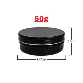 Ficha técnica: Material: alumínio de alta qualidade Capacidade: 50g Dimensões: altura de 2,5cm com um diâmetro de 7cm Cor: preto Fechamento: tampa rosqueável para vedação segura Reciclabilidade: 100% reciclável, contribuindo para a sustentabilidade ambiental