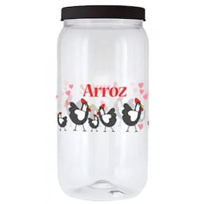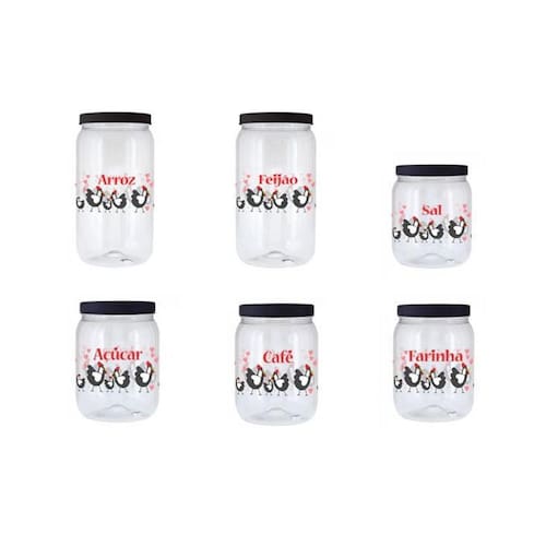 Kit Pote Mantimento Galinha C/6 Pçs Departamento COZINHA Cor PRETO Color BLACK Pote para Mantimentos com estampa de Galinha e Tampa de rosquear é perfeito para deixar sua cozinha organizada Desenvolvido em plástico PET transparente, o recipiente que é 100% livre de BPA possui em sua estrutura o nome do alimento armazenado e fundo transparente, facilitando a diferenciar um pote do outro. pote Sal 1L - 15 x 11cmPote Arroz 2,7L - 25 x 12cmPote Feijão 2,7L - 25 x 12cmPote Açúcar 1,7L - 17 x 13cmPote Café 1,7L - 17 x 13cmPote Farinha 1,7L - 17 x 13cm Marca: Não Informado Ean: 7909876543495