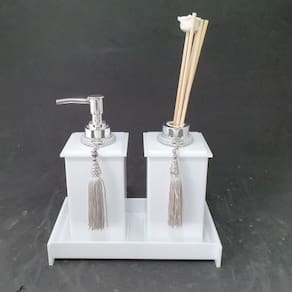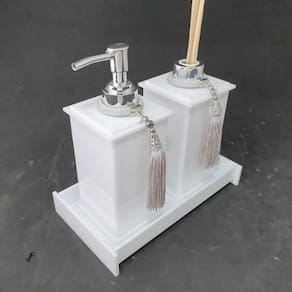Kit Potes Em Acrílico Para Banheiro 3 Pçs Luxo K15BR1 Este Kit contém: 1 Bandeja Acrílica Pequena Retangularmulti uso tamanho 20cm x 11cm x 3cm. 1 difusor de ambiente medidas do difusor - 7 cm x 7cm x 14 cm. 1 saboneteira liquida – 7cm x 7cm x 18cm Mais detalhes sobre o produto: Bandeja: Excelente produto multiuso para seus acessórios. Também serve como porta objetos, porta difusores de vidro, maquiagens, porta copos, organizador de gavetas e outros... O acrílico é um produto resistente, atóxico e fácil de lavar. Basta água corrente e sabão neutro. Não muda de cor com o passar do tempo. 1 difusor de ambiente com pingente decorativo e frasco para 200ml de essência do seu gosto (não acompanha). Você pode adquirir as essências aqui em nossa loja também. (amadeirado, alecrim ou romã com lichia – todos 200mL) . Acompanha conjunto de varetas (4 varetas + 1 vareta decorativa) 1 Saboneteira liquida em acrílico com válvula ABS Cromada e pingente decorativo. Possui frasco interno fácil de higienizar em pet com capacidade para 200ml de sabonete líquido. Medidas – 7cm x 7cm x 18cm Maravilhoso conjunto 3 peças na cor Branco. Tudo o que o seu banheiro precisa com muita classe, estilo e praticidade. O acrílico é um produto resistente, atóxico e fácil de lavar. Basta água corrente e sabão neutro. Não muda de cor com o passar do tempo. Que tal uma bancada organizada, com cada coisa em seu devido lugar? Tudo com muita praticidade e muito estilo ? Conheça a nossa linha de acessórios para banheiros. Tudo confeccionado com acrílico cast de primeira qualidade. Altamente durável. Nosso material é atóxico, não possui cheiro e não muda de cor com o passar do tempo. Garantia: 3 meses
