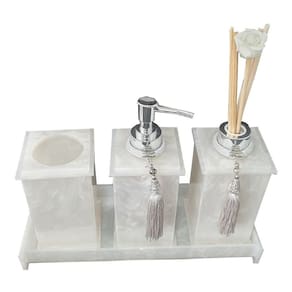 Kit Potes Em Acrílico Para Banheiro 4 Pçs Luxo K15PE4 Este Kit contém: 1 Bandeja Acrílica Pequena Retangularmulti uso tamanho 20cm x 11cm x 3cm. 1 Pote vazadomulti-uso. Medidas 7cm x 7cm x 13 cm (Tampa com orifício raio 5,5cm ) 1 difusor de ambiente. medidas do difusor - 7 cm x 7cm x 14 cm 1 Saboneteira Liquida em Acrílico com Válvula ABS Cromada e Pingente Decorativo. Possui frasco interno fácil de higienizar em pet com capacidade para 200ml de sabonete líquido. Medidas – 7cm x 7cm x 18cm (altura) Mais detalhes sobre o produto: Bandeja: Excelente produto multiuso para seus acessórios. Também serve como porta objetos, porta difusores de vidro, maquiagens, porta copos, organizador de gavetas e outros... O acrílico é um produto resistente, atóxico e fácil de lavar. Basta água corrente e sabão neutro. Não muda de cor com o passar do tempo. Pote vazadomulti-uso: Pode ser utilizado como porta escova de dente , porta escova de cabelo, pentes, pincéis de maquiagem além de outros. Difusor de Ambiente com Pingente decorativo e frasco para 200ml de essência do seu gosto (não acompanha). Você pode adquirir as essências aqui em nossa loja também. (amadeirado, alecrim ou romã com lichia – todos 200mL) . Acompanha conjunto de varetas (4 varetas + 1 vareta decorativa) Maravilhoso conjunto 4 peças na cor pérola. Tudo o que o seu banheiro precisa com muita classe, estilo e praticidade. O acrílico é um produto resistente, atóxico e fácil de lavar. Basta água corrente e sabão neutro. Não muda de cor com o passar do tempo. Que tal uma bancada organizada, com cada coisa em seu devido lugar? Tudo com muita praticidade e muito estilo ? Conheça a nossa linha de acessórios para banheiros. Tudo confeccionado com acrílico cast de primeira qualidade. Altamente durável. Nosso material é atóxico, não possui cheiro e não muda de cor com o passar do tempo. Garantia: 3 meses