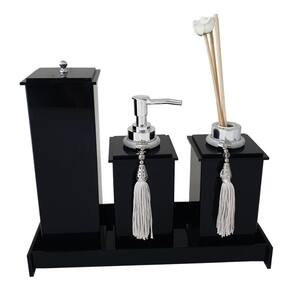 Kit Potes Em Acrílico Para Banheiro 4 Pçs Luxo K15PT2 Este Kit contém: 1 bandeja acrílica média retangular multi uso tamanho 27cm x 11cm x 3cm (altura) 1 difusor de ambiente com pingente. medidas- 7 cm x 7cm x 14 cm (altura) 1 saboneteira liquida com válvula abs cromada e pingente decorativo. Medidas – 7cm x 7cm x 18cm (altura) 1 Porta Escova de dente com tampa e puxador metálico. Medidas 7cm x 7cm x 22cm (altura) Mais detalhes sobre o produto: Bandeja: Excelente produto multiuso para seus acessórios. Também serve como porta objetos, porta difusores de vidro, maquiagens, porta copos, organizador de gavetas e outros... O acrílico é um produto resistente, atóxico e fácil de lavar. Basta água corrente e sabão neutro. Não muda de cor com o passar do tempo. 1 saboneteira liquida em acrílico com válvula abs cromada e pingente decorativo. Possui frasco interno fácil de higienizar em pet com capacidade para 200ml de sabonete líquido. Medidas – 7cm x 7cm x 18cm 1 difusor de ambiente com pingente decorativo e frasco para 200ml de essência do seu gosto (não acompanha). Você pode adquirir as essências aqui em nossa loja também. (amadeirado, alecrim ou romã com lichia – todos 200mL) . Acompanha conjunto de varetas (4 varetas + 1 vareta decorativa) 1 Porta Escova de dente com tampa e puxador metálico. Possui suporte interno para separar as escovas da pasta de dente. Maravilhoso conjunto 3 peças na cor Preto. Tudo o que o seu banheiro precisa com muita classe, estilo e praticidade. O acrílico é um produto resistente, atóxico e fácil de lavar. Basta água corrente e sabão neutro. Não muda de cor com o passar do tempo. Que tal uma bancada organizada, com cada coisa em seu devido lugar? Tudo com muita praticidade e muito estilo ? Conheça a nossa linha de acessórios para banheiros. Tudo confeccionado com acrílico cast de primeira qualidade. Altamente durável. Nosso material é atóxico, não possui cheiro e não muda de cor com o passar do tempo. Garantia: 3 meses