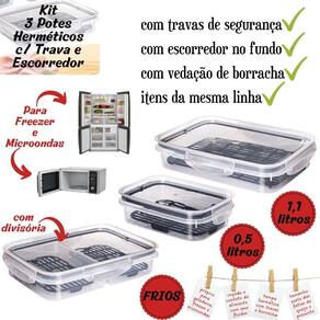 Kit com 3 potes plásticos, sendo um porta frios com duas divisórias, um com capacidade para 0,5 litros e outro para 1,1 litros (as dimensões dos potes estão informadas no final desta descrição). Possuem vedação de borracha na tampa e 2 (0,5L) e 4 (Frios e 1,1L) travas laterais para uma melhor fixação e conservação dos alimentos armazenados. Seu escorredor inferior mantém os alimentos fora de contato com resíduos líquidos que podem se soltar dos alimentos e se acumular no fundo do pote. São produzidos em polipropileno de alta resistência e durabilidade e material atóxico livre de bisfenol (BPA Free). Podem ser levados ao freezer e micro-ondas.