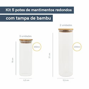 Esse é o Kit de potes de vidro hermético para mantimentos com tampa de bambu da OIKOS.