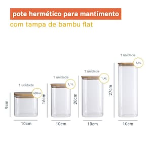 Esse kit é composto por: 1 Pote de Vidro Quadrado 600ML com Tampa de Bambu Flat – Oikos Altura: 8,5 cm - Largura: 10 cm - Comprimento: 10 cm 1 Pote de Vidro Quadrado 1100ML com Tampa de Bambu Flat – Oikos Comprimento: 10 cm - Largura: 10 cm - Altura: 15,5 cm 1 Pote de Vidro Quadrado 1400ML com Tampa de Bambu Flat – Oikos Comprimento: 10 cm - Largura: 10 cm - Altura: 20 cm 1 Pote de Vidro Quadrado 1900ML com Tampa de Bambu Flat - Oikos Comprimento: 10 cm - Largura: 10 cm - Altura: 27 cm