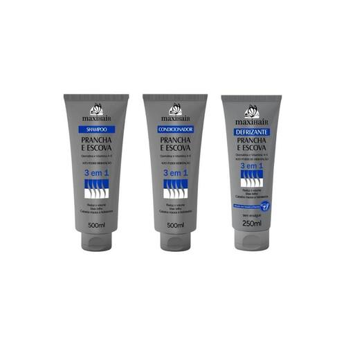 Esse kit contém: 1 Shampoo Maxihair 500ml Prancha e Escova 3 em 1, 1 Condicionador Maxihair 500ml Prancha e Escova 3 em 1 e 1 Defrizante Maxihair 250ml Prancha e Escova 3 em 1.
