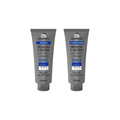 Esse kit contém: 1 Shampoo Maxihair 500ml Prancha e Escova 3 em 1 e 1 Condicionador Maxihair 500ml Prancha e Escova 3 em 1.