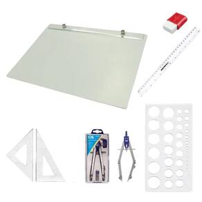 Composição do kit: prancheta mod. A4 madeira formica branca; compasso técnico; jogo de esquadro 26 cm; régua 30 cm, borracha plástica e gabarito de circulos em milímetros d2.