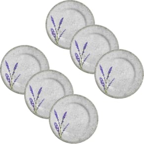 Especificaçãoes do Produto Prato de Sobremesa Alfazema Alleanza Medidas: 3,5cm Altura x 25cm Diâmetro Quantidade no kit: 6