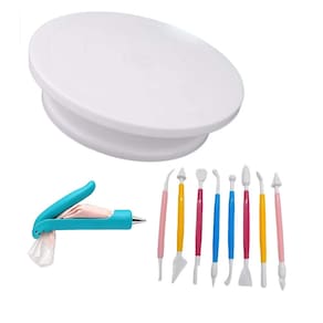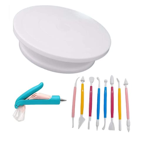 Prato Giratório BailarinaA Bailarina é ideal para montar e confeitar bolos e tortas com muito mais praticidade, gira 360º manualmente, bem semelhante as utilizadas por grandes Chefs.Limpeza:Para melhor manutenção utilize sabão neutro e esponja macia, secar com flanela. Evite o uso de produtos abrasivos.- Suporta até 2 Kg- Sistema de rolamento SIMPLES e estável para confeitar com maior precisão- Decore Bolos com maior praticidade e de forma profissional- Fácil de Limpar, produto plástico atóxico- Material: Plástico- Dimensões: 27,5 cm x 6,5 cm---------------------------------------------------------------------------------------------------------------------------------------------------------Caneta Confeiteiro P/ Decorar Bolos C/ 4 Saquinhos e 4 BicosAgora decorar bolos e biscoitos é tão fácil quanto escrever com uma caneta! Basta encher o saco com glacê, inserir na caneta e decorar.O design ergonômico garante um controle preciso e faz um arrumado e limpo. Ideal para decorar bolos, cup cakes e biscoitos. Se encaixa perfeitamente na sua mão para decorar rápido e criar projetos detalhados e mensagens escritas, acompanha 2 sacos de modo que você possa usar . Decore bolos tão facilmente como se você estivesse escrevendo com uma caneta.MEDIDAS APROX.:Saquinho: 40cmCaneta: 16cm x 4cmBicos de inox: 4cm-------------------------------------------------------------------------------------------------------------------------------------------------------------------------------Kit De Estecas Para Pasta Amaricana Modelagem 8 FerramentasEstecas são espátulas com pontas e funções variadas.Elas contam com diferentes tipos de pontas e facilitam o trabalho de quem cria esculturas manuais pra decorar bolos, por exemplo, em pasta.Ideal para modelagem de pastas, fondant, plastilina e etc.. São 8 estecas que proporcionam uma infinidade de efeitos.Excelente produto que vai auxiliar no acabamento de diversos trabalhos artísticos, seja em, confeitaria ou artesanato.Vai auxiliar nos menores detalhes para ficarem maravilhosos.CUIDADOS:Para garantir a durabilidade do produto, recomenda-se secá-los após a lavagem;Deixar fora do alcance de crianças.Medidas: 15cm x 0,5cmItens Inclusos:1 Caneta decoração4 sacos de decoração2 acoplador4 bicos altamente resistente e lavável1 Prato Bailarina giratório8 Estecas modeladoras Marca: Não Informado