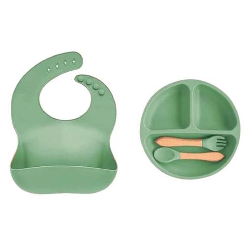 Kit Prato Ventosa Babador Colher e Garfo Infantil Silicone Cor: Verde Kit Prato Ventosa Babador Colher e Garfo Infantil Silicone