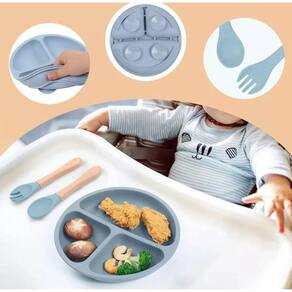 Kit refeição introdução alimentar bebê com prato com divisórias e ventosas, babador cata migalhas , garfo e colher de silicone BPA free livre de Bisfenol A atóxico.