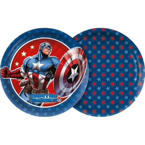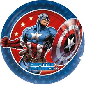 Celebre o aniversário com a bravura do super-herói patriota com o Kit Pratos Capitão América - 12 Unidades de 18cm!