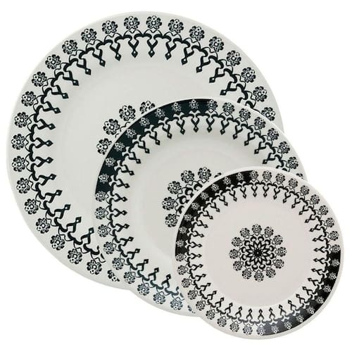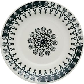 A cor preta é básica e neutra, um verdadeiro curinga na hora de montar a mesa. Nessa louça, colocamos a cor preta numa estampa mais alegre e jovial, perfeita para quem prefere um formato de pratos tradicional com uma decoração mais alegre. A xícara preta, sem decoração, cria uma linda composição com as demais peças.
