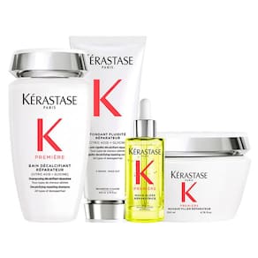 O Kit Kérastase Première Réparateur contém 1 Shampoo de 250 ml, 1 Condicionador de 200 ml, 1 Óleo de 30 ml e 1 Máscara de 200 ml. O Shampoo Kérastase Bain Décalcifiant Réparateur Première, é descalcificante, reparador, sem sulfato, limpa suavemente o couro cabeludo e o cabelo, enquanto remove o excesso de cálcio, que enfraquece ainda mais o cabelo. Ele repara o núcleo do cabelo, com isso as quebras são reduzidas e sua força é restaurada.