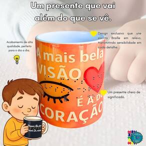 Descubra o Kit Presente 2 Canecas Acessibilidade em Braile alto relevo, perfeito para incentivar a inclusão e o aprendizado de forma sensível e prática. Com design exclusivo em alto relevo, o kit traz uma caneca com o alfabeto completo em Braile e números, facilitando o reconhecimento tátil, e outra com a frase inspiradora A mais bela visão é a do coração, promovendo conexão emocional profunda.