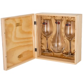 Sobre as taças: O conjunto perfeito para manter o equilíbrio entre enaltecer e dar um completa experiência do sabor do vinho. Projetada por Claus J. Riedel da 9 geração, com formato e lábios largos destacam o aroma irresistível do vinho, ao mesmo tempo que equilibra a acidez e não enfatiza o álcool, para criar uma imagem perfeita do vinho.