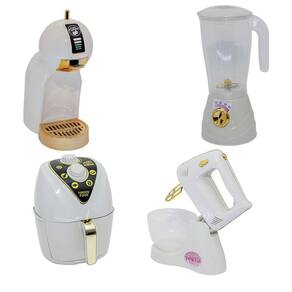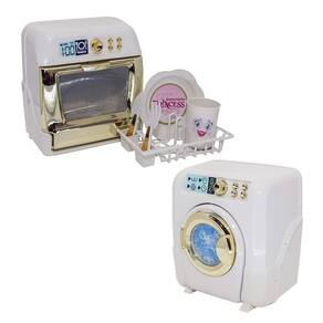 Esse kit possui máquina de lavar roupa, máquina de lavar louça, liquidificador, microondas, fogão cooktop com panelinhas, air fryer, cafeteira, panelinha de pressão, batedeira, frutinhas e legumes