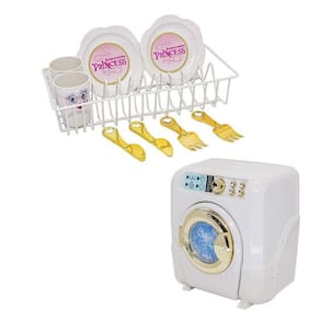 Esse kit possui máquina de lavar roupa, escorredor com louça, liquidificador, microondas, fogão cooktop com panelinhas, air fryer, cafeteira, panelinha de pressão, batedeira, frutinhas e legumes, potinhos de mantimentos