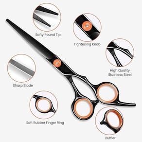 Kit de corte de cabelo Atender a todos os seus cortes de cabelo e necessidades de penteado. Aço inoxidável de alta qualidade. As tesouras de cabelo são feitas de aço inoxidável japonês de alta qualidade. Resistente à corrosão, à prova de ferrugem e não desbota. A tesoura de barbeiro apresenta lâminas precisas e lâminas polidas à mão para facilitar o corte de cabelo. Design ergonômico Tesoura de aparar cabelo profissional Tesoura de textura são equipadas com parafusos de ajuste, você pode ter uma boa aparência nesta tesoura sem esforço para atender às suas necessidades para tensão e aperto. Seu Design exclusivo permite com que tenha um corte confortável e preciso. Conjunto de tesoura de barbeiro Fcysy é seguro e suave com o comprimento de 6 polegadas. É seguro e fácil de usar para homens, mulheres, idosos, crianças e bebês! Diferente de outras tesouras de fiação de cabelo no mercado, a tesoura da store h8 apresenta uma textura suave de aço inoxidável que reduz a desordem de cabelo bagunçado. Serviço conveniente, se houver algum problema, Sinta-se à vontade para entrar em contato conosco, temos uma equipe especializada pronta para atender e ajudar a resolver como for possível.