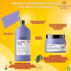 Este kit contém01 shampoo loréal blondifier gloss 1500ml01 máscara loréal blondifier gloss 500mlA linha A linha blondifier foi desenvolvida especialmente para um tratamento iluminador e neutralizante para loiros ou descoloridos.Deixando os fios loiros com muita vida e saúde. Toque macio, brilho e luminosidade intensos.Ativos Açaí polyphenols:Importantes antioxidantes que previnem o desgaste oxidação dos cabelos claros ou descoloridos, sensíveis às exposições climáticas, poluição e outros fatores. Vitaminas e ceramidas:Preenchem as estruturas capilares danificadas e porosas, dando resistência, força e mais movimento.Indicado- cabelos loiros.- cabelos com coloração.- cabelos descoloridos.- cabelos desbotados.- cabelos danificados.- todos os tipos de cabelos.Benefícios- limpeza.- hidratação.- luminosidade e brilho intenso.- força.- proteção uv.- nutrição.- restauração.- proteção antioxidante.- maciez.- manutenção da cor.Shampoo O shampoo loréal blondifier gloss limpa suavemente, restaurando e intensificando a luminosidade e brilho multidimensional do cabelo loiro, proporcionando maciez e nutrição.Seu principal ingrediente, o açaí polyphenols, é um importante antioxidante, que previne a oxidação dos cabelos loiros ou descoloridos, além de reparar possíveis danos diários causados por exposições climáticas, poluição e outros fatores externos.Máscara Máscara de tratamento para cabelos loiros, descoloridos ou com mechas que precisam de reparação.Loréal professionnel série expert blondifier com ação antioxidante, proporciona maciez e nutrição, trazendo vida e brilho intenso.Ela conta com uma fórmula nutritiva, que recupera as áreas porosas e reverte o ressecamento causado pela coloração. Além disso, alinha cutículas para brilho intenso e efeito disciplinado.Modo de uso ShampooCom o cabelo molhado, distribua o shampoo e massageie bem até formar espumas. Enxágue.Repita caso necessário. MáscaraCom os fios limpos e úmidos, aplique e espalhe pelo comprimento e pontas, massageie as mechas e deixe agir alguns minutos.Enxágue. DicaPara melhores resultados, use a linha completa blondifier gloss de l'oréal.