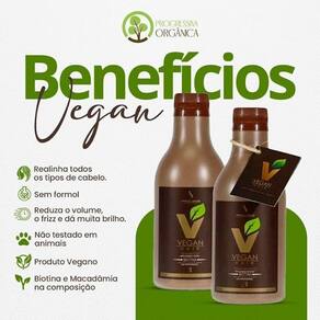 Para você que deseja ter mais praticidade no dia a dia de forma fácil e descomplicada no conforto da sua casa. A progressiva orgânica vegan hair não possui formol não possui ardência, não tem cheiro forte O kit progressiva orgânica vegan hair foi pensado para proporcionar um realinhamento perfeito sem danificar os fios, ideal para todos os tipos de cabelos: liso, ondulado, cacheado e crespo.