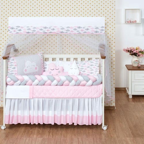 Kit Protetor de Berço Menina Nuvem Trança 11 Peças. Serve em berço americano e nacional.