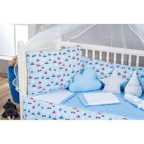 Kit Protetor Berço Carrinho Azul Menino 2 Laterais 8 Peças