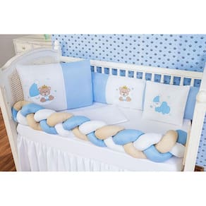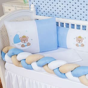 Este produto foi desenvolvido pensando no máximo conforto e bem estar do seu bebê. Por isso, ele é fabricado com materiais de alta qualidade. Tudo para garantir a segurança dos pequenos e tranquilidade para os pais.Características:- Material de alta qualidade- Produzido pensando na segurança do bebêEspecificações TécnicasProduto: Kit Protetor Berço Padrão Americano Ursinho Lua Azul 6 PçsMarca: L2MModelo: Kit para berço nacional e americanoCor: AzulGênero: MasculinoMaterial:Tecido: 70% poliéster/ 30% algodãoEnchimento 100% poliésterMosqueteiro 100% poliamidaMedidas:1 cabeceira------------------0.65x0.40 mts1 lateral -----------------------1.25x0.25mts1 trança --------------------1.25x0.12 mts1 almofada -----------------0x25x0.25 mts1 fronha ---------------------0.28x0.38 mts 1 lençol com elástico inteiro---- 130cm x 70cm x 15cmInformações importantes:O produto já vai pronto para o uso, com o enchimento já incluso.Acompanha as peças conforme a descrição, não esta incluso o berçoA cabeceira e lateral do kit possuem zíper para retirar o enchimento, facilitando assim uma possível lavagem do produto.Trança deve ser lavada a secoA saia não acompanha Marca: L2m