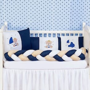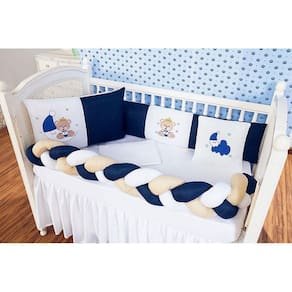 Este produto foi desenvolvido pensando no máximo conforto e bem estar do seu bebê. Por isso, ele é fabricado com materiais de alta qualidade. Tudo para garantir a segurança dos pequenos e tranquilidade para os pais.Características:- Material de alta qualidade- Produzido pensando na segurança do bebêEspecificações TécnicasProduto: Kit Protetor Berço Padrão Americano Ursinho Lua Marinho6 PçsMarca: L2MModelo: Kit para berço Nacional e AmericanoCor: Azul MarinhoGênero: MasculinoMaterial:Tecido: 70% poliéster/ 30% algodãoEnchimento 100% poliésterMosqueteiro 100% poliamidaMedidas:1 cabeceira------------------0.65x0.40 mts1 lateral -----------------------1.25x0.25mts1 trança --------------------1.25x0.12 mts1 almofada -----------------0x25x0.25 mts1 fronha ---------------------0.28x0.38 mts 1 lençol com elástico inteiro---- 130cm x 70cm x 15cmInformações importantes:O produto já vai pronto para o uso, com o enchimento já incluso.Acompanha as peças conforme a descrição, não esta incluso o berçoA cabeceira e lateral do kit possuem zíper para retirar o enchimento, facilitando assim uma possível lavagem do produto.Trança deve ser lavada a secoA saia não acompanha Marca: L2m