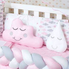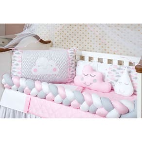 Kit Protetor de Berço Menina Nuvem Trança 11 Peças. Serve em berço americano e nacional. Pronto para deixar sua princesa mais segura e confortável, o Kit Berço Nuvem Trança deixa o quarto da sua pequena mais alegre e cheio de amor. Nessa criação exclusiva, a decoração do quarto de bebê ganha estampas e bordados . O edredom Dupla Face Matelado aquece nos dias mais frios do ano, enquanto o jogo de lençol, com fronha, lençol de cima evita o contato entre o neném e a superfície do colchão. Preocupado com a segurança do seu amor, os protetores cabeceira e laterais evitam o contato do bebê com a estrutura do móvel, dessa maneira eles não prendem os bracinhos e as perninhas nas grades. TOTAL 11 PEÇAS 1 Cabeceira------------------0.57X0.37 mts 1 Lateral -----------------------1.25X0.25mts 1 Trança --------------------1.25X0.12 mts 1 Lençol de cima ------------1.30X0.90 mts ------ 100% ALGODÃO 1 Fronha ---------------------0.28x0.38 mts ------ 100% ALGODÃO 1 Bando do mosqueteiro---1.40x0.20 mts 1 Mosqueteiro---------------4.50x1.50 mts 1 Almofada nuvem --------0.40x0.20 mts 1 Almofada Gota ----------0,30 x 0,22 mts 1 SAIA BOX -------------1,30 x 0,70 x 0,30 mts 1 Edredom-------------------1.30X0.75 mts Descrição das peças :Tecido estampado 100% algodão Tecido liso 100% poliéster Jogo de lençol tecido 100% ALGODÃO Enchimento 100% poliéster Mosqueteiro 100% poliamida Informações Importantes: O produto já vai pronto para o uso, com o enchimento já incluso. Acompanha as peças conforme a descrição, não esta incluso o Berço A cabeceira e as laterais do kit possuem zíper para retirar o enchimento, facilitando assim uma possível lavagem do produto. Marca: L2m Ean: 7890201050156
