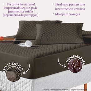 Kit protetor colchão casal + 2 capa de travesseiro impermeável + saia box marrom O kit impermeável matelado é o um combo indispensável para sua cama. O protetor e o porta travesseiros impermeável irão proteger seu colchão e travesseiro de eventuais acidentes com bebidas, líquidos, sujeira em geral e também da transpiração noturna, o que poderá proporcionar maior vida útil para seu enxoval.